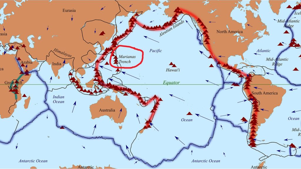 रिंग ऑफ फायर में मारियाना ट्रेंच (Mariana Trench) भी शामिल है, जोकि सबसे गहरी ज्ञात महासागरीय खाई है। मारियाना ट्रेंच पश्चिमी उत्तरी प्रशांत महासागर की तलहटी में स्थित एक गहरी समुद्री खाई है। यह मारियाना द्वीप समूह (Mariana Islands) से लगभग 124 मील (200 किलोमीटर) पूर्व में स्थित है। मारियाना ट्रेंच की लंबाई 1,580 मील (2,540 किलोमीटर) से भी अधिक है, जबकि इसकी औसत चौड़ाई 43 मील (69 किलोमीटर) है। मारियाना ट्रेंच उत्तरी मारियाना द्वीप समूह (Northern Mariana Islands) और गुआम (Guam) के अमेरिकी आश्रित क्षेत्रों (U.S. dependencies) के भीतर स्थित है। इसे 2009 में अमेरिकी राष्ट्रीय स्मारक घोषित किया गया था।