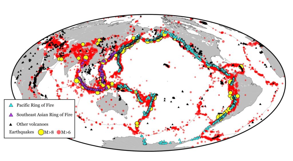 यह क्षेत्र कई टेक्टोनिक प्लेट्स (जैसे पैसिफिक प्लेट, नाज़का प्लेट और फिलीपींस प्लेट) के संगम स्थल पर मौजूद है। ‘रिंग ऑफ फायर’ प्रशांत महासागर के चारों ओर का एक भौगोलिक क्षेत्र है, जो भूकंप और ज्वालामुखी गतिविधियों के लिए जाना जाता है। यह प्रशांत महासागर के चारों ओर फैला है और इसके तटीय इलाक़ों को जोड़ता है। इसके अलावा, इसे पैसिफ़िक रिम या सर्कम पैसिफ़िक बेल्ट भी कहा जाता है।
